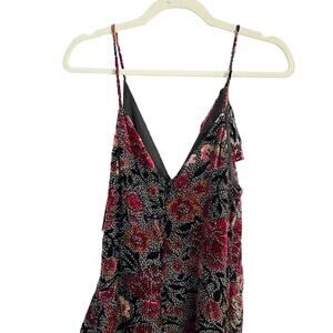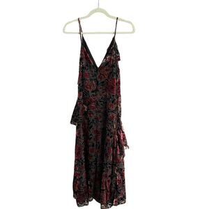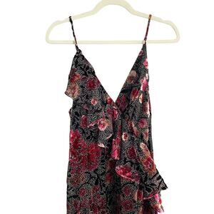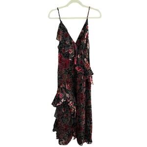 A stunning floral printed midi dress in a classic slip style, completed with cascading ruffle trim