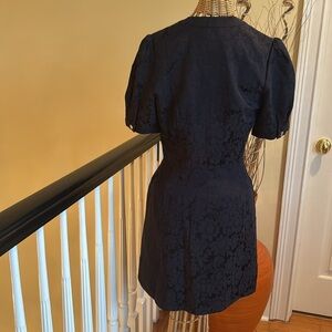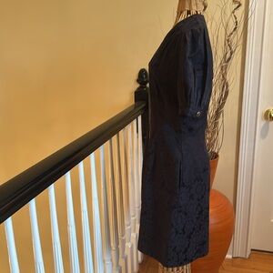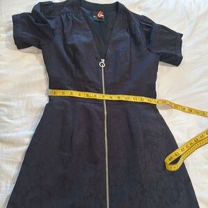 This elegant black dress features a stylish zipper front, perfect for any occasion. Its sleek design offers a flattering fit, making it a must-have in your wardrobe. Has pockets. Look measurements