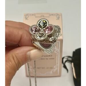 Authentic Jill Stuart lip balm ring featuring a silver-toned ornate design with four pastel rhinestones. The balm compartment is empty, ready to be refilled with your favorite lip color or solid perfume.