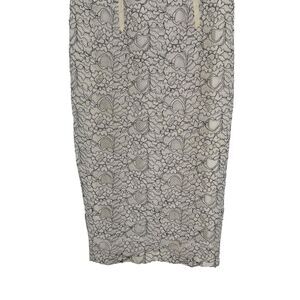 JILL, Jill Stuart, Love Glow, sheath dress, lace dress, embroidered lace, illusion neckline, crew neck, sleeveless dress, pencil skirt, grosgrain ribbon, waist detail, back slit, hidden zipper, hook and eye closure, white dress, black lace, white and black dress, bridal dress, wedding guest dress, rehearsal dinner dress, cocktail dress, evening dress, party dress, formal dress, semi formal dress, special occasion dress, designer dress, women’s size 2, size 2 dress, fitted dress, sheath cocktail dress, lace sheath, lace