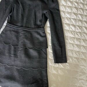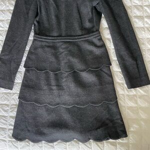 Chic charcoal gray dress with long sleeves and scalloped skirt design. Perfect for formal occasions.