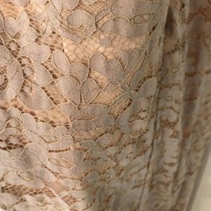 Grey stretch lace (100% Nylon). Sleeveless. V-neck. Fitted skirt with ruched sides. Hidden back zipper with hook-and-eye closure. Lined. Imported. Color: Pink/Nude. Worn one time and in perfect condition! Such a flattering dress. Great for prom or wedding.