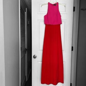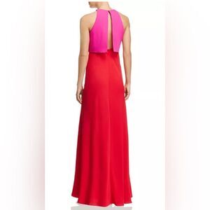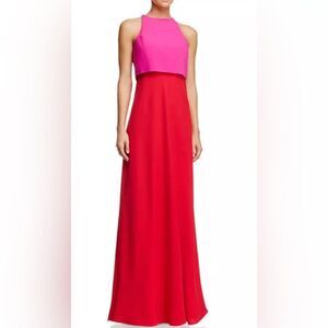 Rose and cherry hues make a fresh and shocking color pairing on this clean, streamlined gown from Jill Jill Stuart.