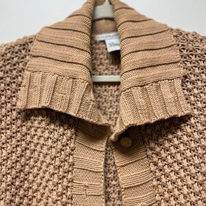 Elevate your wardrobe with this elegant tan knit cardigan. Perfect for layering, it offers both comfort and style.
