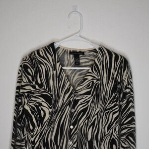 Pre-owned, good condition w/ small repairs. No visible holes or stains. Normal signs of wear. Black and ivory zebra pattern. V-neckline. Long sleeves. Button front w/ mother of pearl buttons. Size per tag: L (Large) Knit blend: 70% Lambswool/ 20% Angora Rabbit Hair/ 10% Nylon. Hand wash. Size per tag does not guarantee desired fit, please see pictures for measurements.