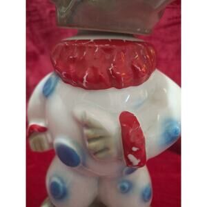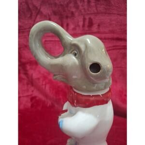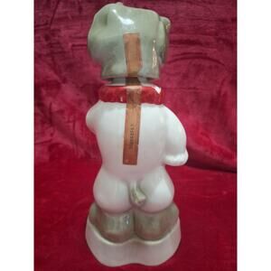 Vintage Jim Beam “Elephant Clown” Beamstrophy whiskey decanter, handcrafted by Regal China. Features a gray elephant head and red, white & blue clown outfit. Labels and tax strip intact, original cork stopper included. Excellent overall condition with no chips, cracks, or repairs. Minor paint loss on both red cuffs and collar, as shown. Bottle is empty, sold for display only.