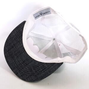 This is a classic snapback trucker style featuring a breathable mesh back. The hat is primarily white on the front panel and brim, with a gray mesh back and adjustable snap closure.