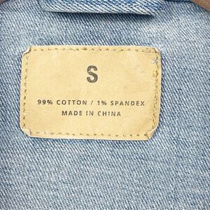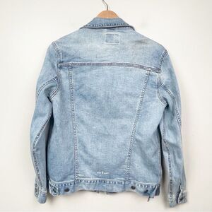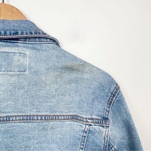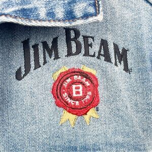 Stylish light blue denim jacket with Jim Beam logo. Features button closure and chest pockets.