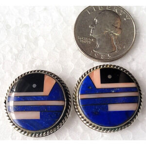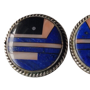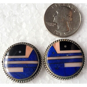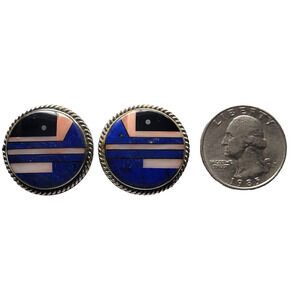 Handmade by Native American artist Jim Harrison, these stunning sterling silver round stud earrings feature a striking geometric inlay pattern using lapis lazuli, black onyx and mother of pearl. Perfect for collectors or anyone who loves bold, artisan-crafted jewelry.