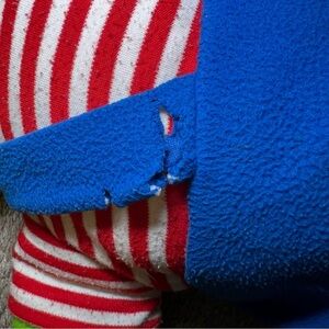 See pictures. Tags are a little worn. The back strap has some tearing.