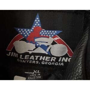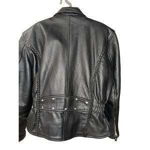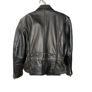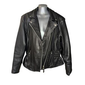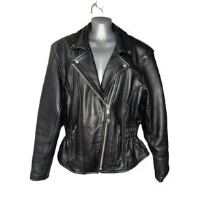 The Jim Leather Inc Ladies Black Motorcycle Jacket in size XL is a vintage piece with a solid black color and a short length, perfect for a biker or 80s/90s themed look. Made of leather with a polyester lining and Thinsulate insulation, this jacket features long sleeves, a double zip closure, and various accents like buttons, buckles, and braided leather details. With a regular fit and multiple inner and zipped pockets, this biker jacket offers both style and functionality for any motorcycle enthusiast. Made in the United States, this jacket is a classic addition to any woman's wardrobe.