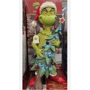 Add a touch of festive mischief to your décor with this Grinch holiday creation. Featuring the classic character in his Santa hat, tugging a decorated Christmas tree, this piece captures the humor and heart of the season. With Jim Shores signature craftsmanship and bold, hand-painted details, its a whimsical and charming addition to any holiday collection.