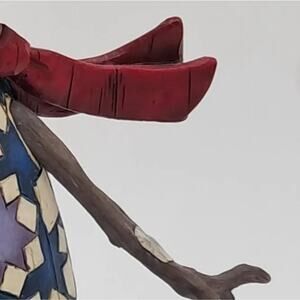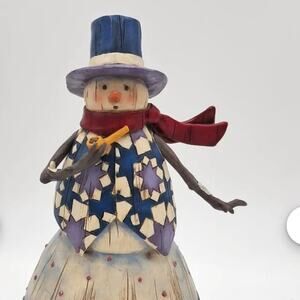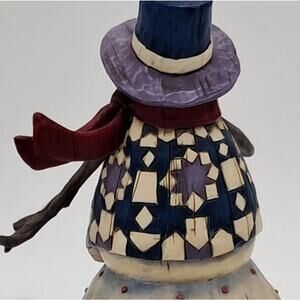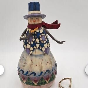 Charming snowman figurine by Jim Shore. Features a blue hat and scarf with colorful details. Comes with original box.