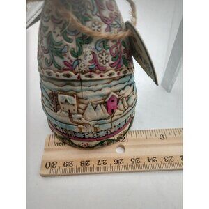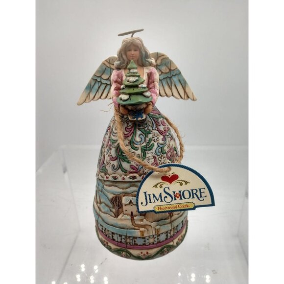 This intricately hand-painted 6-inch figurine by Jim Shore, part of the Heartwood Creek collection, features a serene angel with a winter scene dress design.