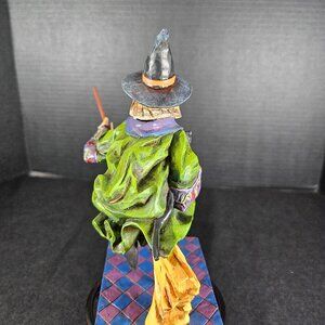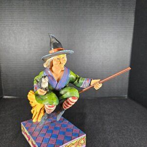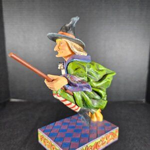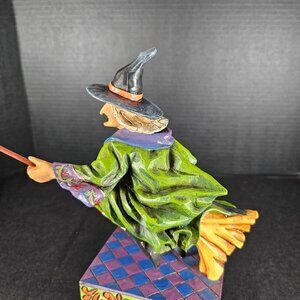 Jim Shore Heartwood Creek Halloween figurine "Swept Away" with a broom and Cat figurine. Celebrate the spooky season with this enchanting Jim Shore, Heartwood Creek Halloween Swept Away witch on a broom with cat figurine. Expertly crafted, this delightful piece captures the whimsical charm and intricate detailing that Jim Sure is renowned for, making it a must have addition to your Halloween decor. The witch stands 6.75 inches at its highest and 7.5 inches at its widest to end of broomstick on a base that is 3.5 inches long and 2.75 inches wide. Figurine is in excellent condition. Upon very close examination. I think the very tip of the witch's hat had a teeny tiny chip and previous owner repaired it. Not really sure because I am not the original owner. I really don't know for sure. I just think the tip of the hat should be pointy. It is really hard to detect. See my pics. There's no paint missing, just not pointy. I found it to be perfect condition otherwise. No box. Dated 2006.