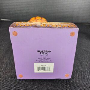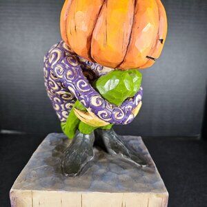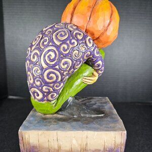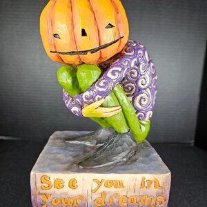 This figurine is the "See You In Your Dreams" peace from the Heartwood Creek Halloween collection by artist Jim Shore. The resin figurine is hand painted and designed to resemble carved wood with folk art patterns. It features a large grinning pumpkin headed character wearing a purple shirt with swirl patterns and green pants crouching on a base that reads "See You In Your Dreams". The figurine was released in 2004. Approximately 7.5 inches tall and the base is 4.5 inches by 4.5 inches. No box, no chips or repairs. Beautiful condition. Non smoking pet free home.