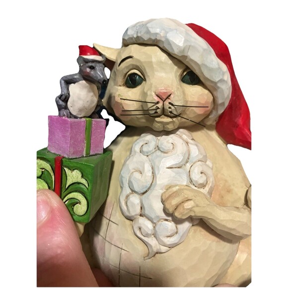 The Jim Shore Heartwood Creek Hand Carved Christmas Cat 4047693 Santa Hat is a small, rustic ornament featuring a hand-carved wooden cat in a Santa hat. This unique piece is part of the Jim Shore collection and is designed to be a festive addition to your holiday decor. Made with resin and carved wood, this ornament showcases intricate details and colorful accents that will charm anyone who sees it. Perfect for cat lovers and collectors alike, this handmade ornament is a delightful way to celebrate the Christmas season. Prepare your tree for a dose of pure, unadulterated kitsch! This is not just an ornament; it’s a chunky, festive feline masterpiece ready to deliver holiday cheer (and maybe a little bit of sass). Featuring a portly kitty clutching presents and a mouse sidekick in a Santa hat, this piece screams "Adorable Holidays."