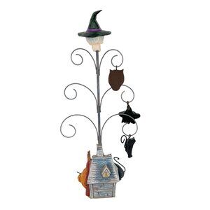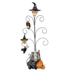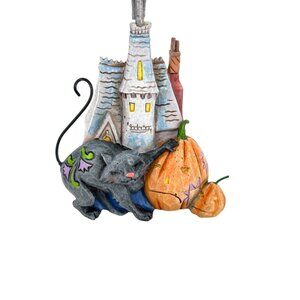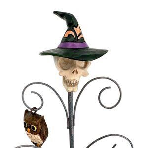 This whimsical Jim Shore figurine features a Halloween theme with a skull topper, pumpkins, and a witch hat, adding a touch of festive charm.