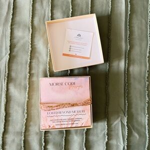 This is a handmade, fair trade bracelet by Jimani Collections. It is part of their Morse Code collection and has a hidden message within the beads that says "Loved Beyond Measure." This bracelet was handmade in a fair trade setting in Nairobi, Kenya. It features rose gold beads and gold chains and is adjustable between 6.5" and 8.5". It comes with all original packaging.