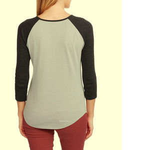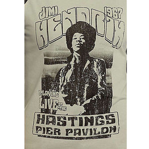 Raglan beige/dark gray top features a front screen of the signature Karl Ferris photo of Jimi Hendrix live at the Hastings Pier Pavilion in 1967 in vintage, distressed style. Rounded hem. Ribbed raglan 3/4 sleeves along with ribbed scoop neckline.