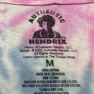 Jimi Hendrix tie-dye T-shirt in size Medium, measuring 22” pit to pit and 27” long. Features bold psychedelic colors and iconic Hendrix graphic. Perfect for classic rock fans and vintage style lovers.