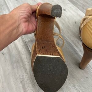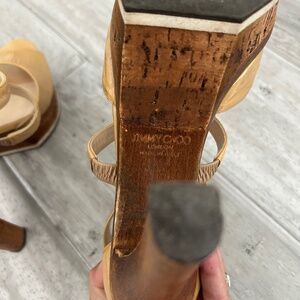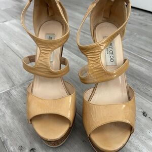 In very good condition - Jimmy Choo patent leather tan platform sandal w/wood heel and zip back enclosure. Minor scuffs as evidenced in photos (most likely can be removed)