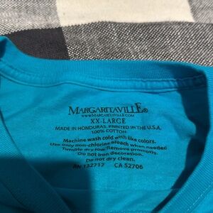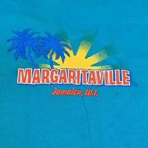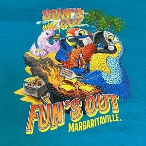 Margaritaville Jamaica, W.I. Suns out funs out jimmy buffet parrots grilling burgers with flakes and soda. Macaw and cockatoo birds. Size XXL. Teal blue color with Jamaica on chest and design on back. I love to bundle!