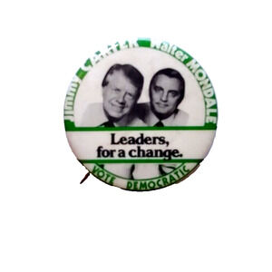 Show your support for the Democratic Party with this vintage Jimmy Carter Walter Mondale campaign button pin from 1976. This collectible pinback features the green and white colors and the patriotic message of voting for the Democratic Party. Made in the United States with high-quality materials, this pin is perfect for collectors and political enthusiasts alike.
