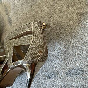 These shoes are covered in a light gold glitter lame fabric and trimmed in leather. The heel is a gold toned stiletto and there is an exposed zipper at the back