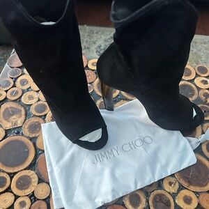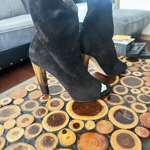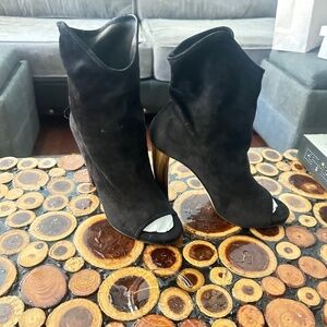 Step into style with these sleek black suede ankle booties featuring a wood-grain stiletto heel and peep-toe design. Perfect for dressing up your jeans, pairing with a skirt, or adding an edge to a night-out look.