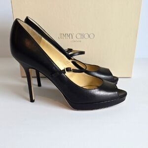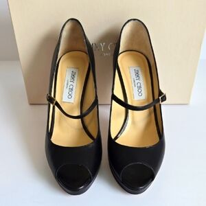 Jimmy Choo 'AMINA' Classic Mary Jane Pumps featuring peep toes, adjustable strap with buckle and platform styling.