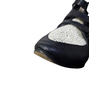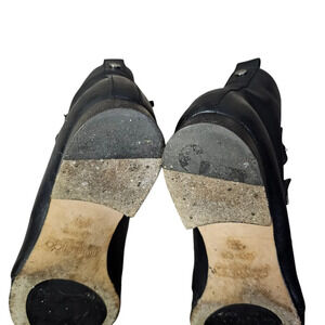 Shoes show signs of wear on outsole, moderate scuffs at soles and toe box;wear on tips of toes. A few small scuffs on leather. Boots are a little creased where feet bend when walking.