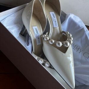 Ivory with pearl beads. Worn once for wedding. Scuffs on sole. Otherwise minimal wear. Dustbag, box. Purchased directly from designer site.