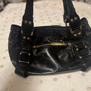 3 outer zipper pockets, snap closure, Gold Tone Hardware, suede lining