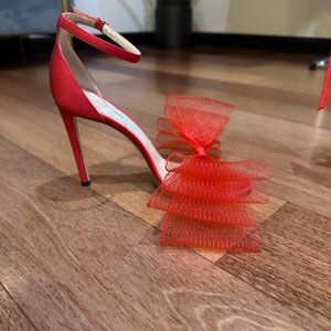 Jimmy Choo Aveline 100 Bow Ankle Strap Sandal Siletto in Red - Size 38.5 / 8 US