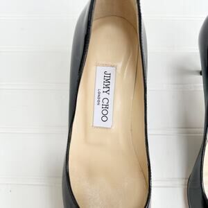 The Jimmy Choo Aza Pumps are a sleek and versatile style crafted in glossy black patent leather. Designed with a pointed toe and a 40mm kitten heel, they strike the perfect balance of elegance and comfort. This classic silhouette is ideal for both professional and evening looks, offering effortless sophistication with the comfort of a lower heel. In excellent, like-new condition, these pumps are a timeless addition to any wardrobe.
