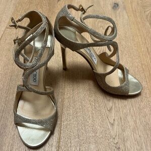 Really pretty Jimmy Choo Azia 95s in a champagne glitter. Only worn a couple times for events, very lightly used. Surprisingly comfortable to walk in.
