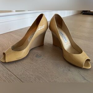 Jimmy Choo Baxen Patent Peep-Toe Wedge Pump size 37.5 Beige color