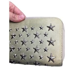 Jimmy Choo Beige / Gray interior star studded leather wallet. Varying size silver stars in nice pattern on exterior. Zip around closure with 2 leather decorative straps on zipper pull with small ring hardware. Slip pockets, Card Slots and Zippered coin pocket in center.