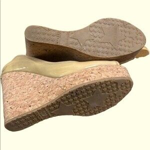 These lovely Jimmy Choo pumps will bring you the right amount of style and shine. They are made from beige patent leather and feature peep toes. They are endowed with comfortable insoles and elevated on cork wedge heels. They are pretty and easy to flaunt. Looks new or worn inside the room only (floor sample) with hardly noticeable minor mark (photo 10). Size 37 ( US 6.5) Please use my photos as part of description. Due to different camera and light color of the item can be slightly different.