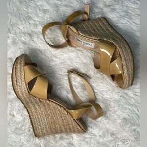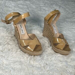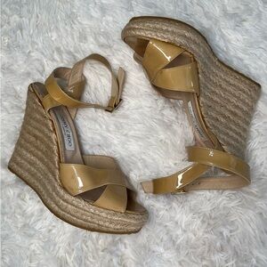 ✨ Jimmy Choo | Beige Patent Leather Phönix Espadrille Wedge Sandals