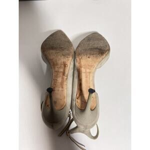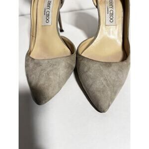 You are bidding on a pair of Lucy heels from Jimmy Choo, size 39 EU, 9 US, beige suede, good used condition. There is a faint red mark on the back of the left shoe, and overall some dirt - please see photos. The right shoe is slightly bumped out around the big toe area, perhaps the owner had a bunion. 3.5" heel, adjustable ankle strap. All sales are final so please email with questions.