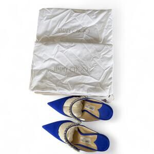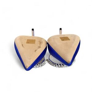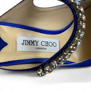 Jimmy Choo Bing 100 Satin Crystal-Strap Mules in Ultraviolet Blue. Size 38. Features: pointed toe, slip on, crystal-embellished instep strap, 4" covered stiletto heel, satin upper, leather lining and sole. Made in Italy. Retails $1950. Like-new condition, only tried on. See photos for markings on soles. Comes with box and dust bags.