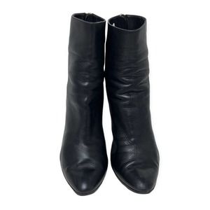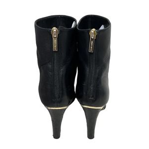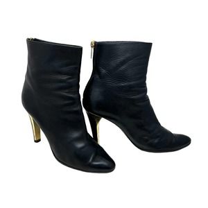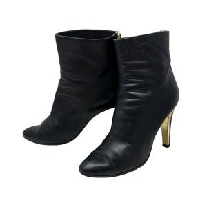 Jimmy Choo black booties with gold heel detail. In good condition with a few small surface marks and heel nicks/color loss (not very noticeable when wearing). Heel height 4". The original insoles show wear.