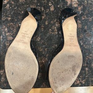 Elegant black heels with gold accents. Perfect for any occasion. Stylish and sophisticated design.