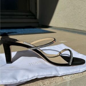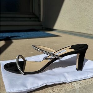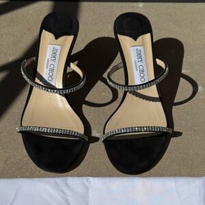 Chic black rhinestone strap high heeled sandals by Jimmy Choo., size 38.5, with 3” heels. Worn only twice. Sandals are in excellent condition but I did walk on a surface where the pavement made some marks on the shoe soles. Please see all photos to assess. Dust bag included.