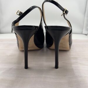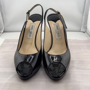 Step into elegance with these black heels from Jimmy Choo, showcasing a sleek slingback strap and a polished patent finish. The high heel and classic silhouette make them ideal for formal occasions, offering a refined touch to your ensemble.
