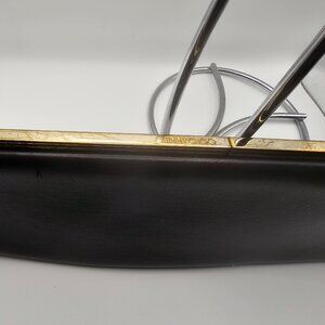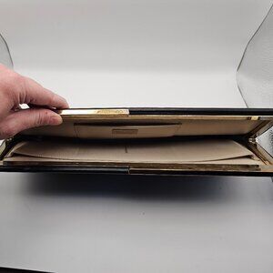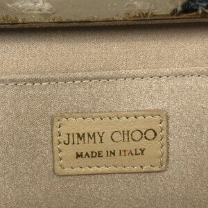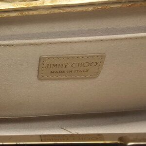 Make a statement with this authentic Jimmy Choo clutch, crafted in black leather with a gold-tone metal frame and curved handles. This large-size evening bag features a structured silhouette, beige interior lining, and the iconic “Jimmy Choo Made in Italy” label. A timeless piece perfect for formal events, collectors, or luxury lovers.