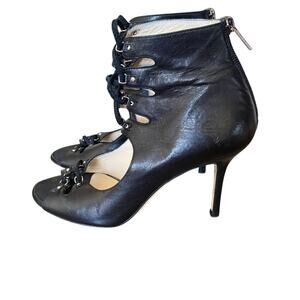 Jimmy Choo Black Leather Cut Out High Heel Sandals size 37 1/2 size 7.5 in great condition- no box. Minor scrapes in leather - see all pics. Heel height is 3 1/2 inches