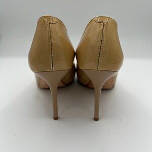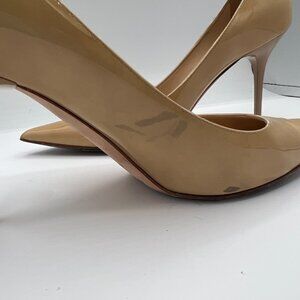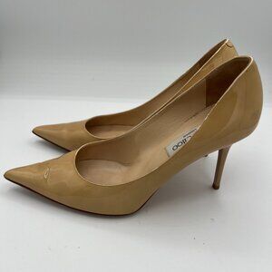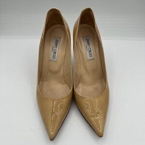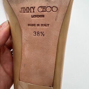 Keywords for SEO: Jimmy Choo patent leather pumps, nude heels, beige designer heels, wedding shoes, office pumps, stiletto heels, luxury shoes.